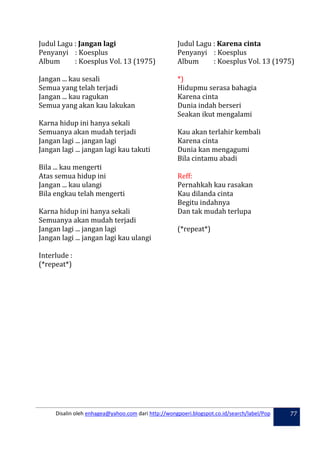 KOLEKSI LAGU PILIHAN KOES PLOES. AlbumBaruCom Di tahun 2018 deretan penyanyi di Indonesia diramaikan oleh banyaknya penyanyi pendatang baru yang berkarya dengan berbagai genreInilah lagu terpopuler di tahun 2018 untuk referensi kamu. Koleksi lirik lagu ini didedikasikan kepada semua pelayar-pelayar internet Malaysia Singapura Brunei Darussalam yang berada di serata dunia walau apa jua situasi mereka.